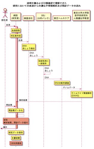 はじめに 説明文書 この研究におけるデータの流れ 血液から遺伝子情報が解析されるまでの流れ 問診データの流れ 情報の保管及び廃棄 個人情報の保護と倫理審査委員会 個人情報の定義 匿名化された問診データは個人情報になるか 説明文書での個人情報保護の記…